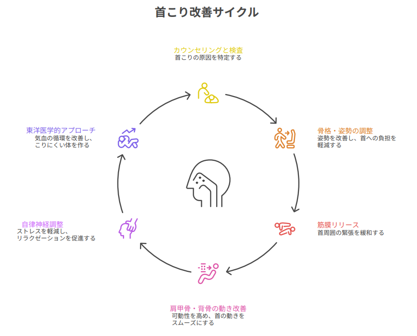 当院では、⾸こりを「結果」と捉え、姿勢‧背⾻‧肩甲⾻‧呼吸‧⾃律神経まで含めて根本から整えていきます。