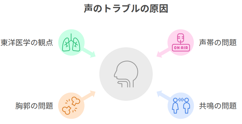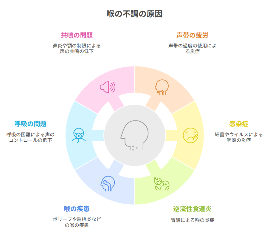 声に関する問題の主な原因は、声帯の疲労や炎症です。